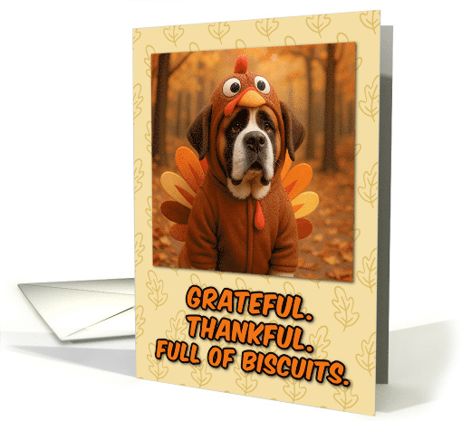 Artist Notes: This heartwarming Thanksgiving card showcases a dog wearing an elaborate turkey costume featuring a hooded design with googly eyes, orange beak, and red wattle. The detailed costume includes layered feather "wings" in various shades of orange and brown, plus a textured chest piece with scale-like patterns. The pup sits against a gorgeous autumn forest with golden foliage. The card has a cream border decorated with delicate leaf motifs. The playful text reads "GRATEFUL. THANKFUL. FULL OF BISCUITS." in bold orange letters with black outlines, perfectly capturing the Thanksgiving spirit with a dog's priorities in mind.