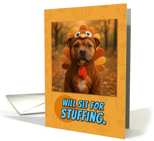 This delightful Thanksgiving card features a dog in a brown turkey costume complete with a hood that has googly eyes, an orange beak, red wattle, and adorable ear flaps. The pup wears a full turkey suit with layered orange and brown tail feathers against a stunning autumn forest backdrop with warm golden lighting. The card has a soft orange border with subtle leaf patterns. The humorous text "WILL SIT FOR STUFFING" appears in bright blue letters with black outlines, cleverly playing on the classic "will work for food" phrase. It's a perfect blend of holiday humor and irresistible canine cuteness.