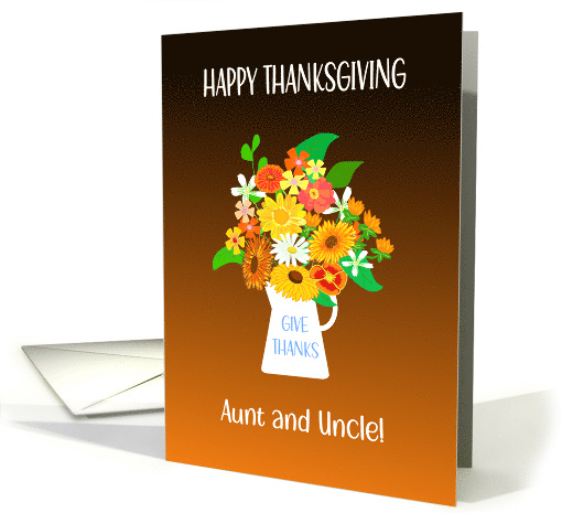 A Thanksgiving card with a beautiful jug of flowers for your aunt and uncle, in bright, warm colours! The orange, yellow, red and white flowers are in a white jug, with the words, 'Give Thanks' on it in light blue lettering. The front cover greeting is, 'HAPPY THANKSGIVING' at the top and 'Aunt and Uncle!' below the flowers, in white lettering on a dark brown background that fades to rusty orange at the bottom. The inside message is just a suggestion and you can easily change it or delete it altogether if you wish.