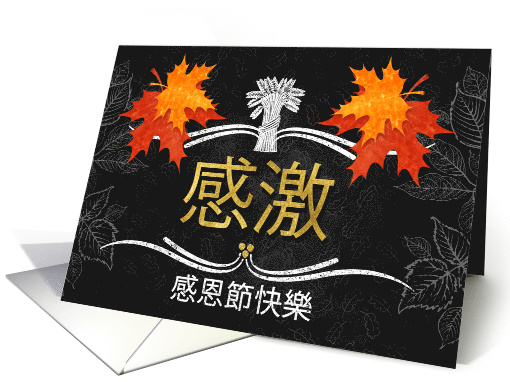 | Artist Notes: | Beautiful and hard to find Chinese Thanksgiving greeting card for the person or family residing in America, who celebrate their Chinese culture and this holiday of gratitude celebrated in the United States. A chalkboard style with bright autumn leaves and artificial gold leaf typography in traditional Chinese calligraphy reading Grateful and Happy Thanksgiving on the front, inside says blessings to you and yours in English. |