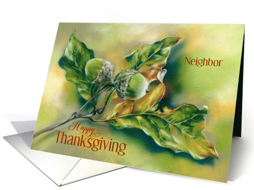 | Artist Notes: | A lovely way to say ‘Happy Thanksgiving’ to a neighbor or personalized for any recipient, this card is embellished with soft pastel autumn botanical artwork picturing two gray-capped acorns with oak foliage of gold and green accented with blue. |