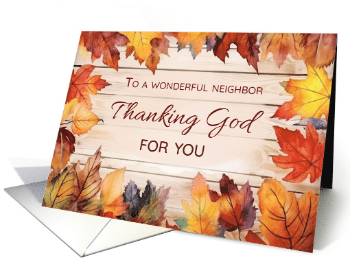 | Artist Notes: | A thoughtful Thanksgiving card for a neighbor featuring rustic wood and autumn leaves in rich seasonal colors. The front text “To a Wonderful Neighbor Thanking God for You” makes this a warm way to share gratitude and faith with someone special in your community. Sandra Rose Designs: https://www.greetingcarduniverse.com/sandrarosedesigns Sandra Rose Designs Two: https://www.greetingcarduniverse.com/sandrarosedesignstwo |
