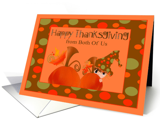 Wish anyone in general a Happy Thanksgiving from both of us with an adorable child wearing a big hat hiding behind a pumpkin next to a bigger pumpkin in a cute brown, green and orange polka dot frame. The background is orange with multicolored text. Inside like all cards on Greeting Card Universe can be personalized if you wish.