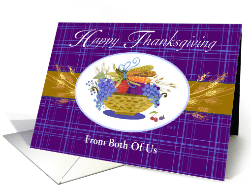 A eggplant purple plaid background makes the basket of fruit and grains stand out in Thanksgiving greeting from both of you. İMindy Pierce