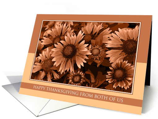A warm, yet vibrant photograph of orange blanket flowers with a two tone background adorns the front of this Happy Thanksgiving from both of us greeting card. Original Photograph and Design by Sue Nollmeyer©2013