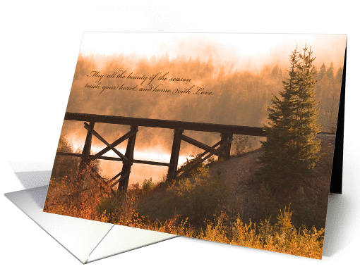 Send a warm Thanksgiving wish with this beautiful photograph of a railroad bridge taken in the misty mountains. Design also available from All of Us and Thanksgiving general. Original Photograph & Design by Sue Nollmeyer©2013. 101513