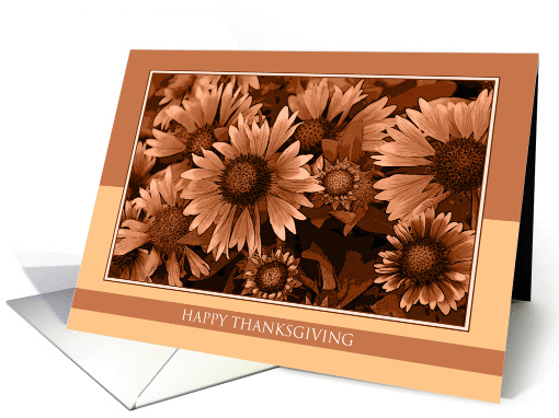A warm, yet vibrant photograph of orange blanket flowers with a two tone background adorns the front of this Happy Thanksgiving greeting card. Original Photograph and Design by Sue Nollmeyer©2013