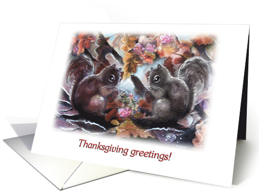 Greetings for that special Thanksgiving day. Two cute squirrels enjoying their Thanksgiving in a cozy place with their gathering of nuts and berries. A perfect Thanksgiving greeting to send to anyone favored on your list.