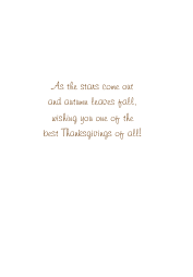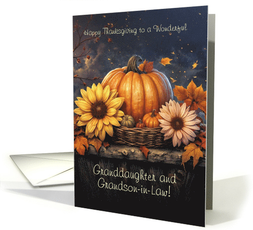 Granddaughter and her husband Thanksgiving card. Set in the evening, as the autumn wind blows leaves past a basket of Thanksgiving seasonal color!
