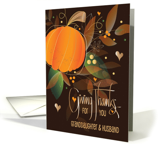 Brighten your Granddaughter and her Husband's Thanksgiving this year with this beautiful fall leaf card that is filled with golden-colored, rust and green leaves that stream across the card, behind magnificent hand lettering of a golden-color. The leaves all start in the top left corner, behind the outlined orange pumpkin brightens the card with holiday joy. The leaves softly provide a draping background of gentle color behind the hand lettered wording of "Giving Thanks" - "For you Granddaughter & Husband". Hearts of your love brighten your card with dots of fall love. Your inside wording to this special couple says "Happy Thanksgiving, with love, to a very loved and special couple!"
