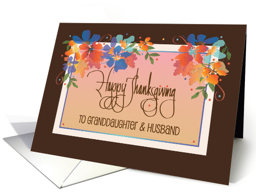 This splendidly radiant Thanksgiving card will let your Granddaughter and her husband know how very special they are to you and will also wish them a wonderfully joyful Thanksgiving. The lovely and meaningful Thanksgiving card combines the beautifully hand lettered brown wording "Happy Thanksgiving", written in flowing calligraphy, on the peachy-shaded middle of the card, beneath the brilliantly colored foliage that drapes over the top of the wording. Two clusters of autumn flowers and leaves, in colors of lavender, aqua, blue, orange and gold enhance the card with vivid colors, that explode out of the dark brown border surrounding the card. The card's inside wording says "Wishing a special couple a Thanksgiving filled with blessings, love and laughter!"