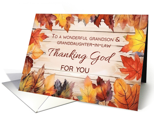 A warm Thanksgiving card for a grandson and granddaughter-in-law decorated with vibrant autumn leaves. The message “To a Wonderful Grandson and Granddaughter-in-Law Thanking God for You” makes this a heartfelt way to share love and faith during the holiday season.