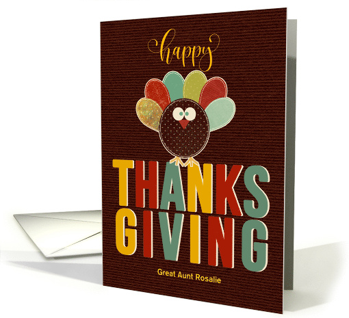 | Artist Notes: | Your Great Aunt will be so excited to see her name on this adorable Thanksgiving card from her great niece or nephews, she's sure to laugh out loud at the cross-eyed, patchwork turkey - thanks goes to Pumpkins and Posies for the usage of the graphic - and the seasonal color palette is sure to be a big hit on this design from the SalonOfArt. |