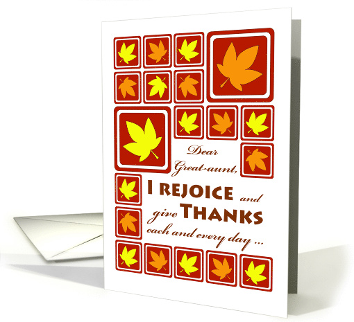 | Artist Notes: | Dear Great-aunt, I rejoice and give thanks each and every day ... for you, Thanksgiving greeting card with fall season colored leaves on red square-looking tiles. Change the verse inside and customize as you want. |