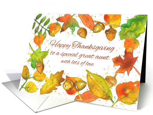 | Artist Notes: | Wish a special great aunt a happy Thanksgiving with this card featuring a variety of colorful fall leaves mingling with acorns and Chinese lanterns accented with watercolor spatter spots for design effect. |