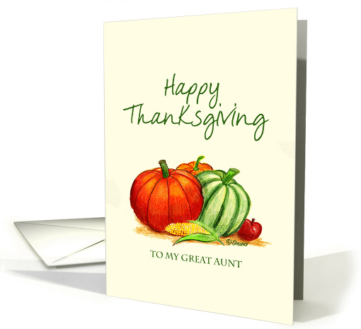 | Artist Notes: | This card shows the drawing of three pumpkins and an apple and a corn on the cob in the front. The design was created with colored pencils and is a wonderful way to send Thanksgiving Greetings to your Happy Thanksgiving to your Great Aunt, |