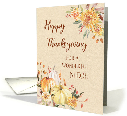Wish your amazing niece a wonderful thanksgiving this year with this charming country style card with autumn pumpkins and rustic flowers.