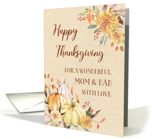 A beautiful card for your mom and dad this thanksgiving with rustic autumn illustrations of pumpkins and leaves.
