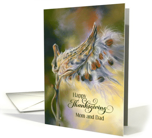 Personalized with any names for your mother and father on the cover, this Thanksgiving greeting card features delicate botanical art in soft pastel tones, showcasing a milkweed pod with seeds emerging in shades of purple, gold, green, and rust.