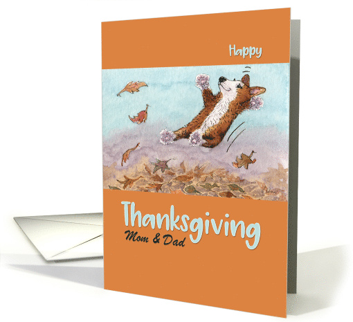 | Title: | Happy Thanksgiving Mom & Dad, Corgi dog jumping in Autumn leaves |