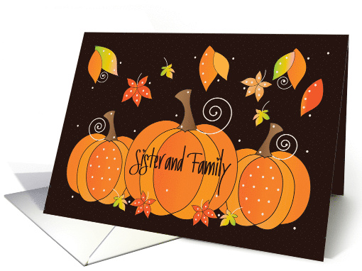 Greet your sister and her entire family with this fun hand lettered Thanksgiving card and its polka dot pumpkins. Three pumpkins, of various sizes, dance across the bottom of this chocolate brown Thanksgiving card, edged with brilliantly-colored autumn leaves. The two little pumpkins, on the ends, have polka dot sections and some of the falling leaves are polka dotted. Each pumpkin has a white curly vine atop it, curling around and around. Confetti dots pepper the dark-colored background. The inside wording of the card says "Giving thanks for our many blessings. Wishing you a wonderful Thanksgiving filled with joy!"