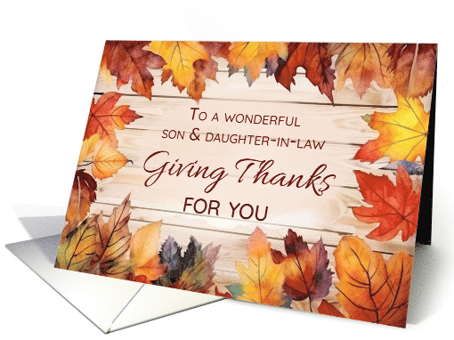 Celebrate a son and daughter-in-law with this warm Thanksgiving card decorated with rustic wood and autumn leaves. A heartfelt way to send gratitude and seasonal appreciation to two special members of the family. See more designs at my two stores: