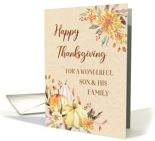 A son and his family happy thanksgiving greeting card with vintage floral arrangements and fall pumpkins.