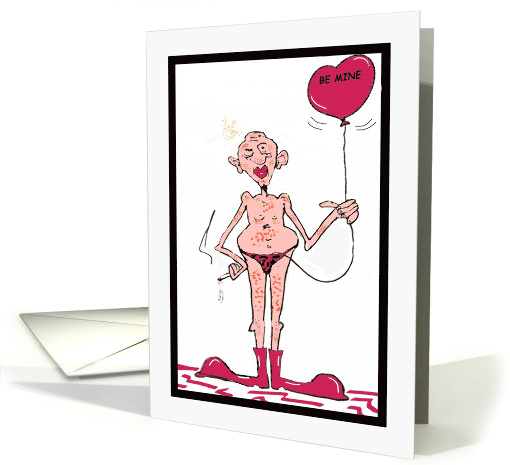 A funny looking bald dude in his undies, stand holding a heart shaped balloon that says be mine, A great funny Valentine card that say's I'm crazy in love with you and I don't care who knows it.