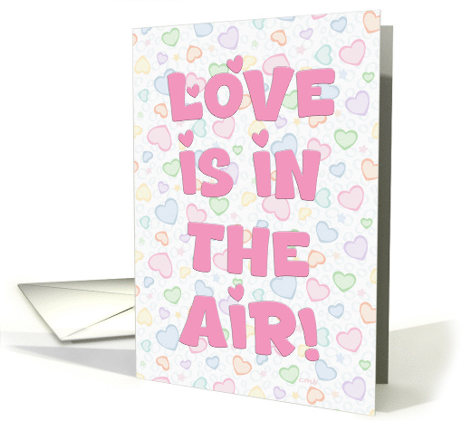 Bold pink lettering with Valentine message on background of floating multicolored pastel colored hearts.