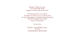 | Inside: | When I think of you, my heart fills with happy memories and love. Knowing that you have chosen to serve your community as an emergency medical technician almost makes my heart burst with pride. I love you. HAPPY VALENTINE'S DAY to my WONDERFUL BROTHER! |