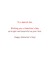 As your daughter and son-in-law celebrate Valentine's Day, this card becomes a thoughtful and personalized gesture of affection. The hand-painted details and carefully chosen colors convey not only the beauty of their unique bond but also the hope for continued happiness and growth in their relationship. It serves as a visual reminder of the love and joy they've shared and a symbol of the promising future ahead. This elegantly crafted card is not just a Valentine's Day greeting but a heartfelt celebration of the enduring connection between your daughter and son-in-law, making it a cherished keepsake for the couple. This intricately designed Valentine's Day card, created for your daughter and son-in-law, is a beautiful expression of love and warmth.