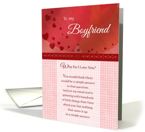 Artist Notes: On Valentine's Day, let your boyfriend know how much you love him and why with this romantic "Why Do I Love You" card, designed by Rycky Creations.