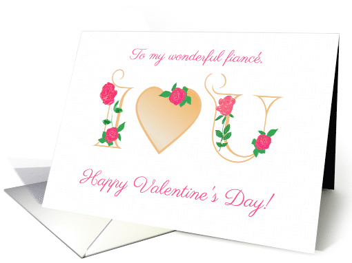 Artist Notes: | Let your fiance know how much you love him with this chic Valentine's Day card to customize on the front, with 'I love (gold-effect heart) U' in large letters, decorated with hand-painted red roses. The front cover greeting is, 'To my wonderful fiance, I (heart) you Happy Valentine's Day!', all on a lightly textured white background. The inside is left blank so that you can add your own message if you wish. |
