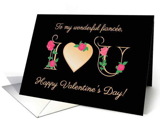 Artist Notes: | Let your fiancee know how much you love her with this chic Valentine's Day card with 'I love (gold-effect heart) U' in large letters, decorated with hand-painted red roses. The front cover greeting is, 'To my wonderful fiancee, I (heart) you Happy Valentine's Day!', all on a black background. The inside is left blank so that you can add your own message if you wish. |