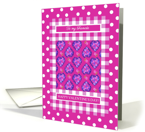 Artist Notes: | A romantic Valentine's Day Card for your fiancee, with a mix'n'match pattern of pink and blue hearts and pink flowers on a magenta background with coordinating check gingham and polka dots. The hearts and flowers pattern is from a handpainted paper collage design by Judy Adamson and the front cover greeting, in white lettering on a magenta background, is, 'To my Fiancee, HAPPY VALENTINE'S DAY!'. The inside is left blank for you to add your own message. |