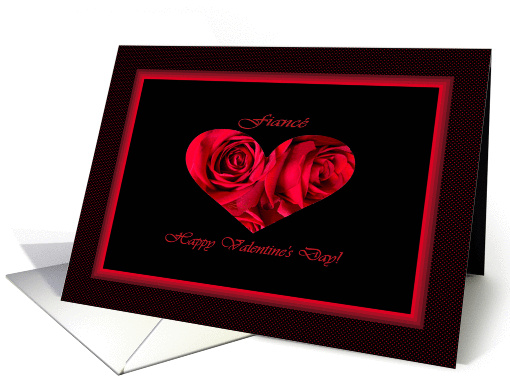 This image shows a heart with two red roses on a black background. The card has this image, a black border with red dots and red line accents, and the expression: "Fiancé, Happy Valentine's Day!"