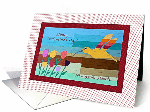 This card has an artistic collage with a hummingbird and flowers by Artcor7 artist. The card has also a red polka dot border with line accents and the expression: "Happy Valentine’s Day! For a Special Fiancée"