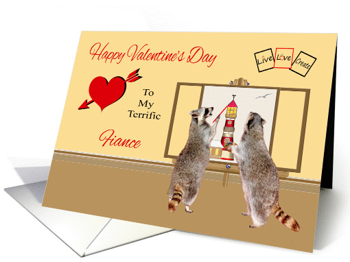 Wish your fiance Happy Valentine's Day with an adorable raccoon painting a pretty lighthouse on a canvas while another raccoon is watching and learning holding a paint palette. Background has a red and black heart. Inside like all GCU cards can be personalized by you if you wish.