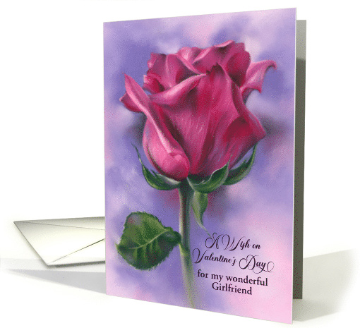 | Artist Notes: | Your girlfriend will appreciate the romance of a Valentine personalized just for her. This card is adorned with a single, elegant rose with petals of velvety, deep pink and a green leaf rendered in soft pastel hues on a background of pale pink and purple. |