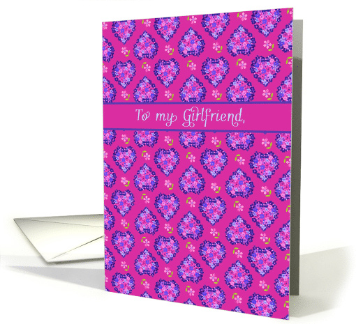 | Artist Notes: | A romantic Valentine's Day card for your Girlfriend, with a very pretty pattern of pink and blue hearts and pink flowers on a magenta background, from a hand-painted paper collage design by Judy Adamson. There is a ribbon-like magenta band across the pattern, with the words, 'To my Girlfriend,' in white lettering and please feel free to change or delete the inside message if you wish. |