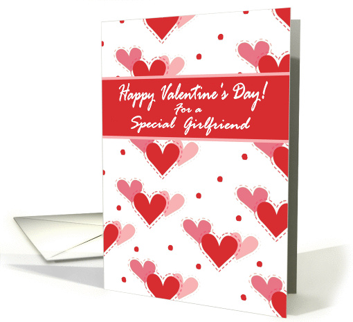 | Artist Notes: | This image shows red dots and rows of three heart in red, pink, and rose on a white background. The card has this image, a red stripe with pink border accents, and the expression: "Happy Valentine's Day! For a Special Girlfriend" |