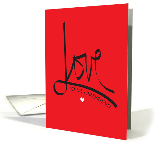 Your Girlfriend is going to love receiving this romantically beautiful, touching and love-filled card from you, this year, for Valentine's Day. The single word "Love" appears in large, elegantly hand lettered black lettering, that swoops across the Valentine red card. Where the base of the capital "L" dashes across the page, the smaller words of "To my Girlfriend", below the long arch and add to the design, by following the curve of the larger letters. More of your love is added to the card, with the tiny, white heart centered beneath the wording. Your inside words to this special lady are "Happy Valentine's Day, with love."