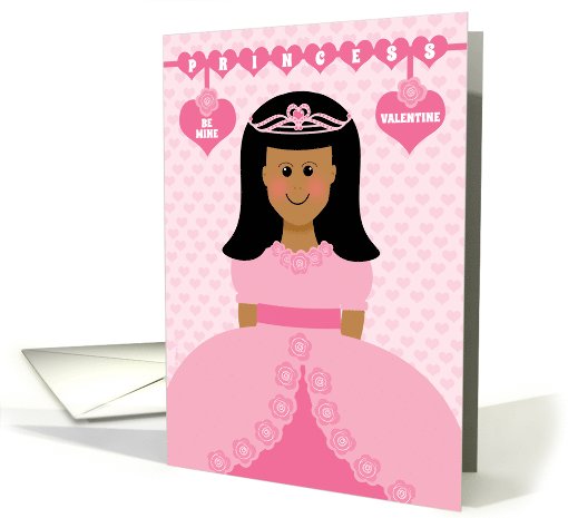 A pretty little princess with dark hair for Valentine's Day. A sweet girl wearing a tiara and a pink gown decorated with roses. Classic Valentine's Day phrases of "be mine" and "Valentine" fill in two pink hearts. Wish a special child a magical holiday! Image and verse © Penny Cork