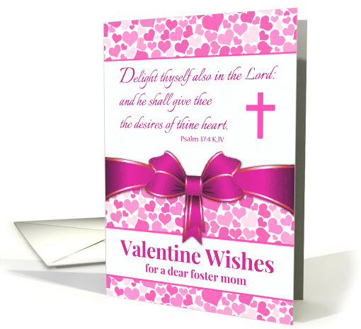 | Artist Notes: | Valentine Wishes for My Dear Foster Mom, paper greeting card with a large magenta colored bow, cross, and small hearts in shades of pink and magenta. Bible scripture from Psalm 37:4 (King James Version). Customize the inside of the card as you like before checking out. |