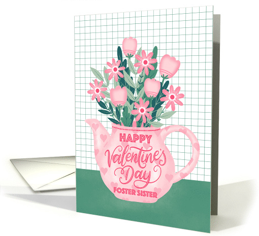 | Title: | Happy Valentines Day Foster Sister with Pink Hearts Teapot of Flowers |
