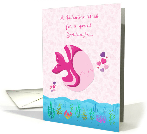 A Valentine wish for Goddaughter with a cute pink fish, heart-shaped bubbles and blue water with colorful coral. The background has a pink heart pattern.