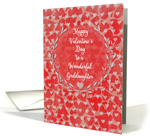 Artist Notes: | Send lovely Happy Valentine's Day greetings to Goddaughter with this pretty design that features a lot of hearts overall the entire design and a white wreath made of vines. |