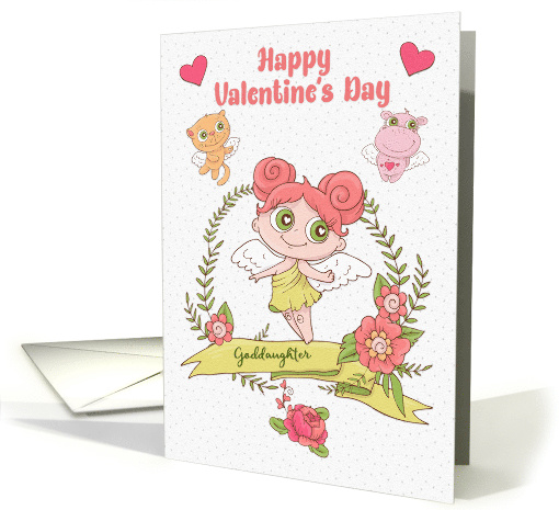 Artist Notes: | Send adorable Happy Valentine's Day greetings to your Goddaughter with this cute little girl with big green eyes that have hearts in them. She is surrounded by a wreath with leaves and flowers. She is accompanied by a cat angel and a hippo angel. The design features a polka dotted background. |