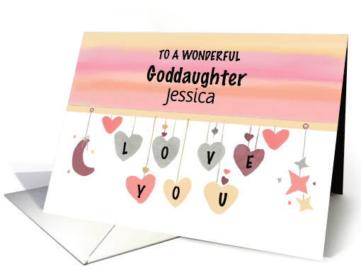 At the heart of this delightful creation, personalized details take center stage. The name "Jessica" becomes a key player in the symphony of affection, intricately integrated into the design. It transforms the card into a tailor-made treasure, a unique declaration of love for a special goddaughter. The celestial scene unfolds with hearts, moons, and stars hanging in a celestial ballet, as if the universe itself is celebrating the charm and sweetness that Jessica brings to this heartwarming relationship. This customizable Valentine's Day card is more than a mere token; it's a love letter in hues and strokes.