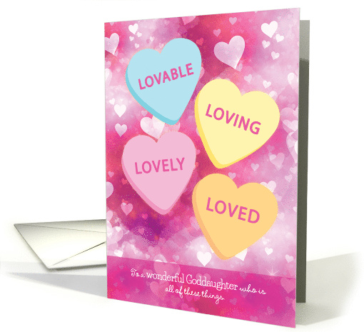 | Artist Notes: | Wish a wonderful Goddaughter Happy Valentine's Day with this sweet card filled with conversation heart candies that describe them perfectly: lovable, loving, lovely, loved. Betting they're going to be flattered and love this one. Happy Valentine's Day! |